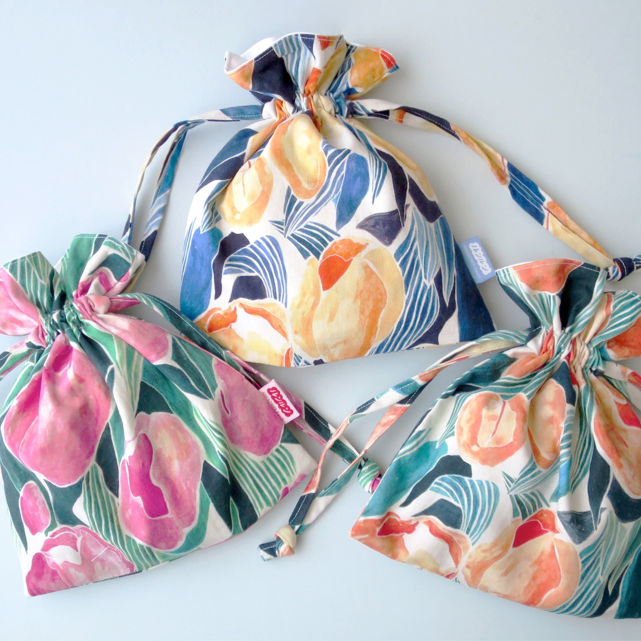 チューリップ柄のオリジナルテキスタイルを使用した、大きめサイズの巾着ポーチです。