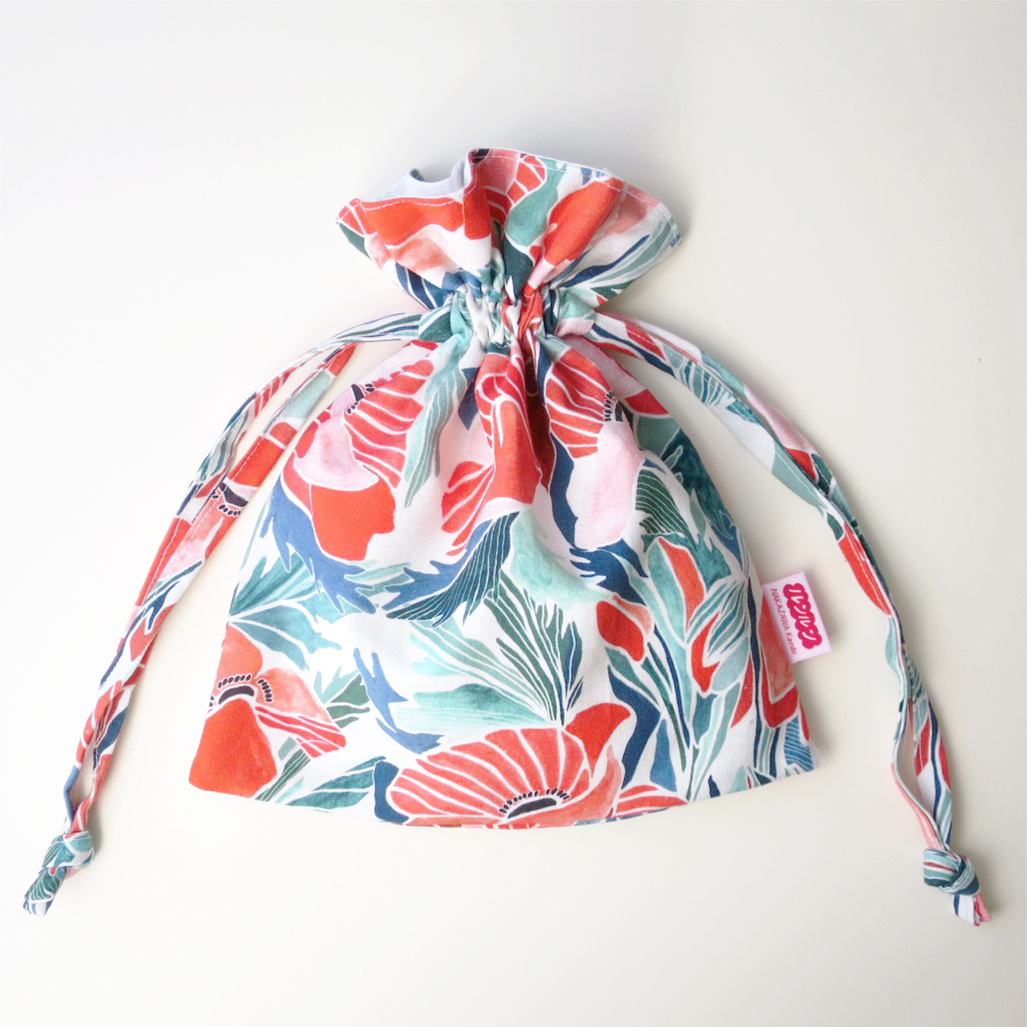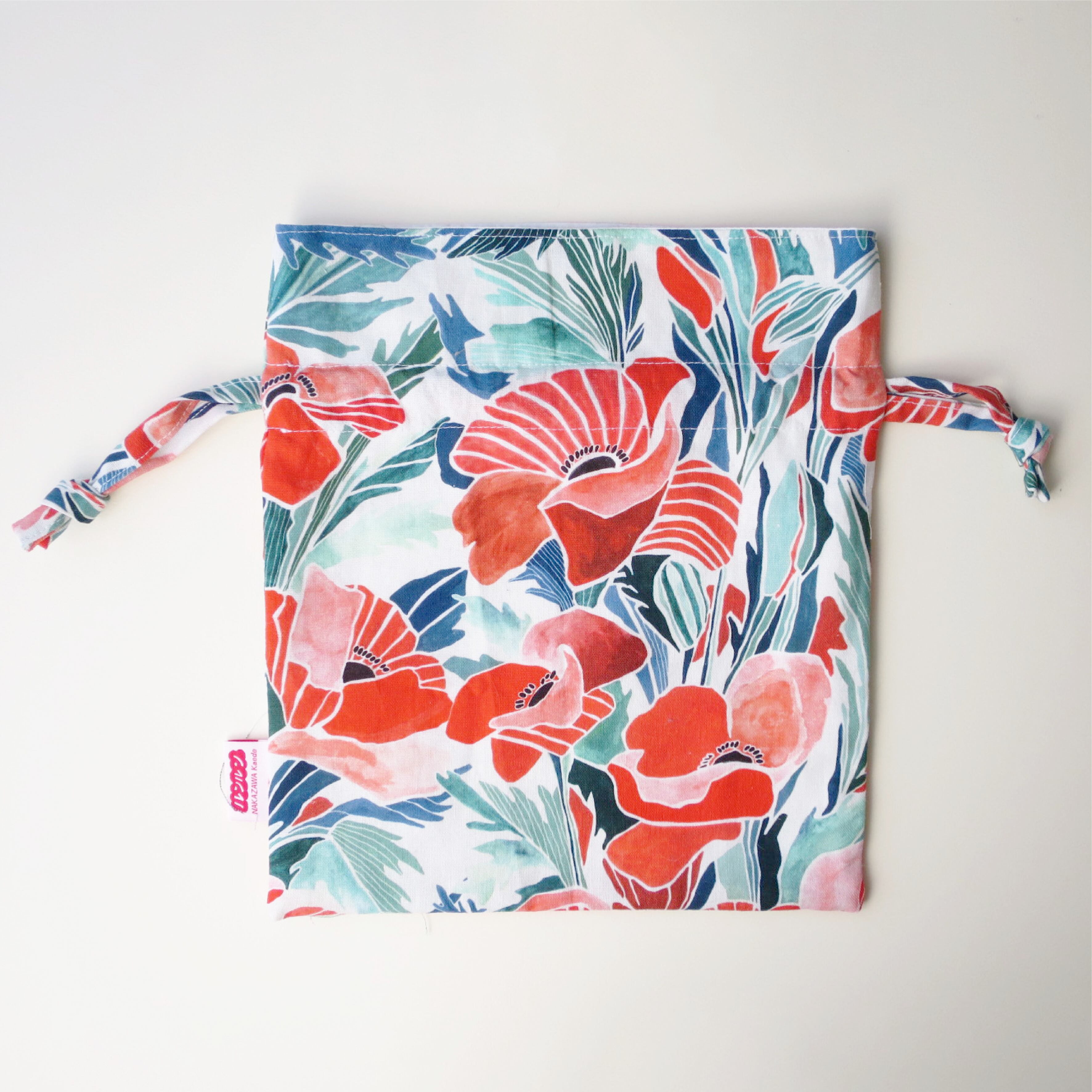ポピー柄のオリジナルテキスタイルを使用した、大きめサイズの巾着ポーチです。