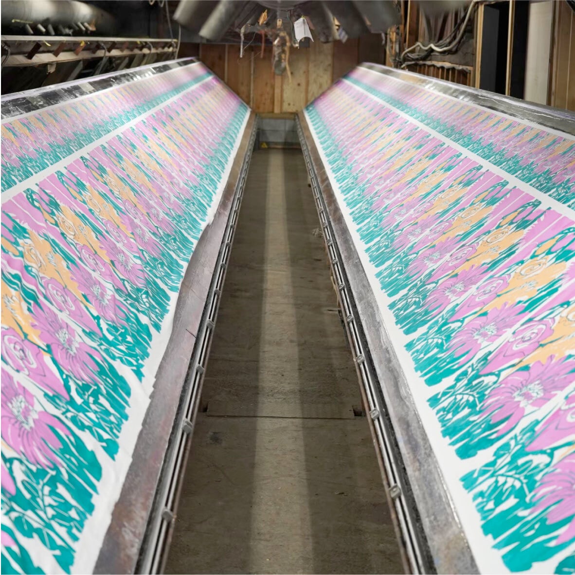空へとまっすぐに伸びる、鮮やかなオレンジや淡いピンクのバラ。一重、ポンポン、スパイダー咲きと、一つひとつ表情が異なるガーベラ。その美しさの傍らには、それぞれの花の個性と対話するように、愛情を込めて育てる花農家の方々の姿がありました。そんな平塚の農園風景と作り手の丁寧な手仕事を、コットンサテンの布にのせてお届けします。