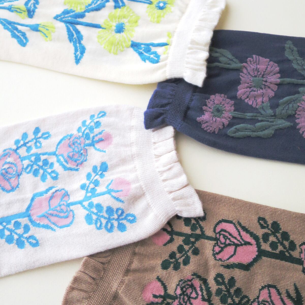 サンダルやスニーカーから覗く、ガーベラをあしらった繊細な編み柄が、毎日のコーディネートにさりげない華やかさをプラスします。大切な人への贈り物にも。
